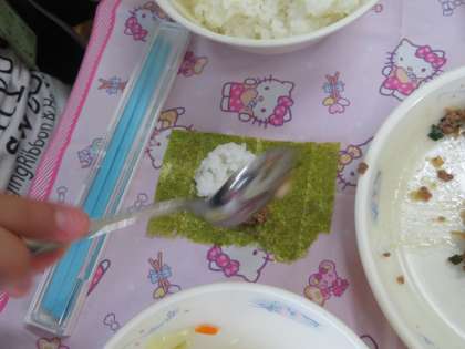 給食に肉みそ納豆が出てきました。自分で巻いて食べることを子ども達は楽しんでしました。納豆菌は血液をサラサラにする働きがあるそうです。