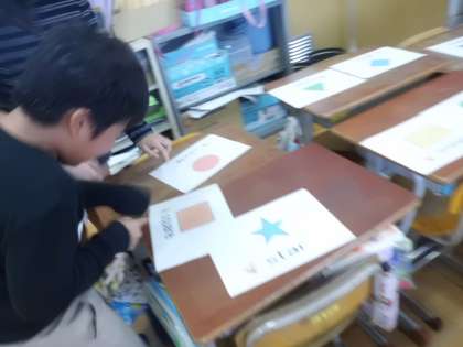 10月17日(火)のイングリッシュデーでは,形を使ったどんじゃんけんにチャレンジ。1つ1つ形を言いながら歩き進む子どもたち。形の英語での言い方に慣れ親しむことができました。