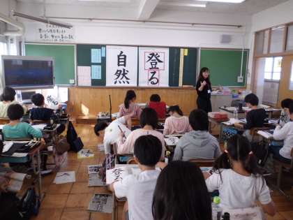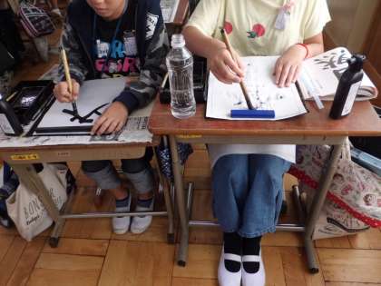 書写では「登る」と「自然」の2つの課題に挑戦。どちらの課題も「漢字と仮名,漢字どうしの大きさに気を付けて,文字のつり合いをとって書くこと」が目標。今回は2つを書き比べ,自分に合った課題を選びました。