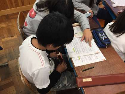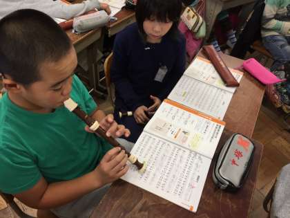 リコーダーで威風堂々の練習を行っています。ファのシャープに苦戦している人が何人かいましたが,友達どうしで優しく教え合うことができました。