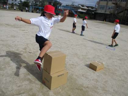 ゴムやケンステップ,はこなどを使って,調子よく跳んだり,遠くまで跳んだりする練習をしています。