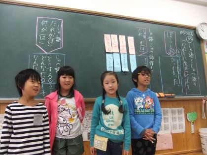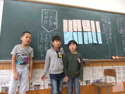 国語科の学習で,主語と述語について勉強しました。班で主語と「どうする」の述語で文作りをしました。「校長先生が走る。」「お母さんがわらう。」などの文を考えることができました。
