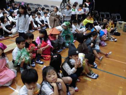 いよいよ学習発表会当日。衣装に着替え,体育館の座席に移動してきた1年生です。出番を前にして緊張が見えます。さあ,頑張るそ!