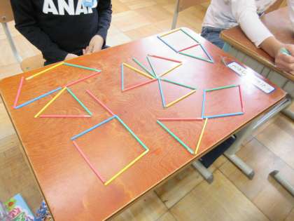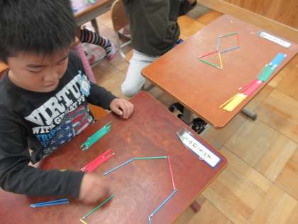 色板は最初から三角形の形をしているので合わせやすかったのですが,数え棒では線と線をつなぐように形を作っていくので,難しい半面,できあがった形に声をあげて喜んでいる子どもたちでした。