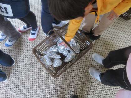 以前収穫したさつまいもを一つずつあらいました。大きいものは,いくつかに分けました。そしてあらったさつまいもをアルミホイルで包みました。
