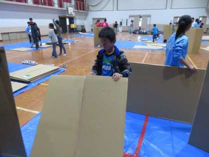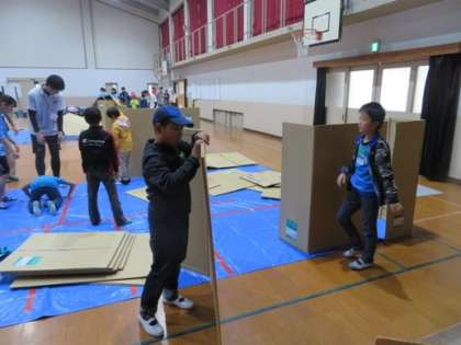 昼食を食べた後は基地作りをしました。設計図を書き,だれがどこに寝るか相談しました。そしてグループで協力しながら,ダンボールで基地づくりをしました。高校生もお手伝いに来てくれて基地を楽しそうに作っていました。