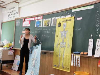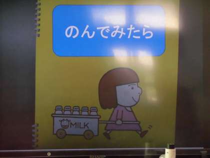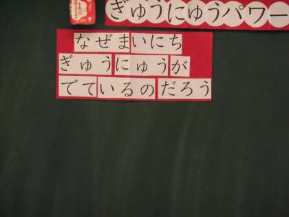 今回のテーマは牛乳。ほとんど毎日給食に出ている牛乳を飲むと,体にどんなよいことがあるかを,お話をつかって教えてもらいました。「力が出る」「骨が強くなる」「背が伸びる」「気持ちが落ち着く」など,牛乳のよいことがたくさん出てきました。その後,牛乳の中に含まれているカルシウムの量を目に見えるようにしてもらい,「こんなにたくさん入っているの?」とびっくりしたり,カルシウムをとることで強くなる人間の骨が206本もあることを初めて知ったりと,たくさんのことを学びました。