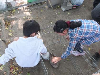 11月7日(火)から,飼育委員会の飼育ふれあい体験が始まりました。校内で飼っているうさぎを触ったり,餌をやったりすることができます。7日は6年生のふれあい体験でした。実際に触ってみると,毛の感触や体の温かさなども感じられました。また,口元にキャベツを持っていくと,うさぎがムシャムシャ食べる様子が見られ,子ども達はとても可愛がっていました。