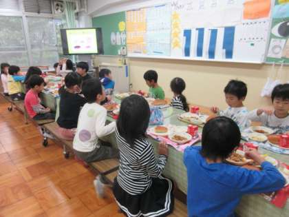 子ども達は,この日を心待ちにしていました。いつもと違う場所,顔を向き合わせての席,それだけでテンションが上がります。しかも,パンとおかずを全員で食べ切ることができれば,栄養教諭の先生から星のプレゼントがあります。