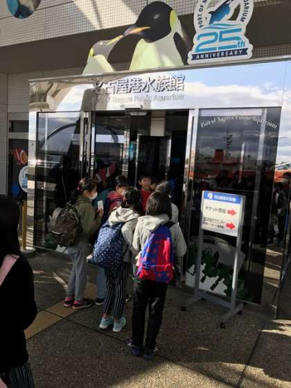 名古屋港水族館に入り,最初に見るシャチに大喜び。シャチは生まれた時から体長が2mほどあるそうです。自分たちと大きさを比べてさらにびっくりしていました。