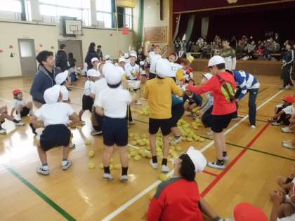 続いての種目は,玉いれです。最初に育成学級の児童だけで玉入れをして,途中から1年生も一緒に加わって競技しました。