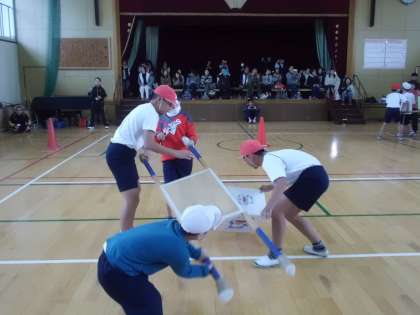 最後の種目は,おみこしリレーです。6年生と一緒にチームを組んで,おみこしの上にのせた箱を落とさないように気をつけながら走りました。