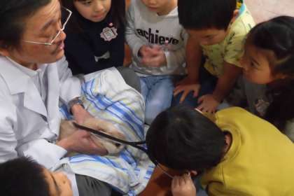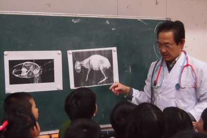 獣医さんに教えていただき,ウサギの心臓の音を聴診器で聞いてみました。自分の心臓の音の速さと比べると,とても速く,みんなびっくりしていました。また,「ウサギの鼻はなぜいつもぴくぴく動いているんですか?」「ウサギの後ろ脚はなぜ曲がっているんですか?」など,疑問に思ったことを質問し,教えていただきました。ウサギの骨格の写真も見せてもらいました。