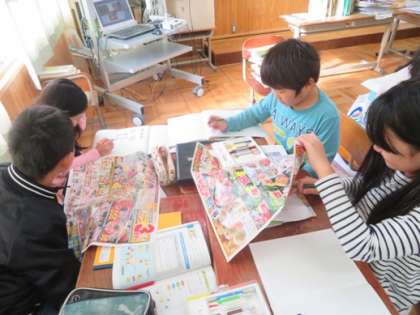 お店で売られている品物はどこから運ばれてくるかを調べました。産地を調べた後,白地図にまとめました。品物は京都だけでなく,全国のいろいろなところから,また外国から運ばれてくることが分かりました。