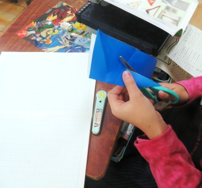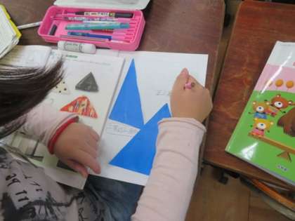 色紙を折ったり切ったりして,二等辺三角形や正三角形を作りました。そして作った三角形を使って2つの辺,3つの辺の長さが等しくなっていることを確かめました。それぞれの三角形の特徴が分かりました。