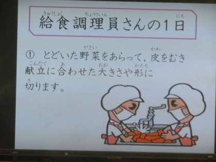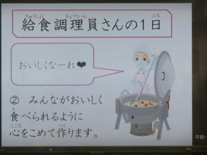 給食室からこんにちはで,給食調理員さんの一日が紹介されました。調理員さんは子ども達のためにおいしい給食を心をこめて作ってくれています。