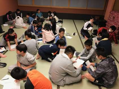 夜のミーティングが始まりました。今日の1日の活動を振り返って,楽しかったことや心に残ったこと,明日楽しみにしていること等を班で交流しました。