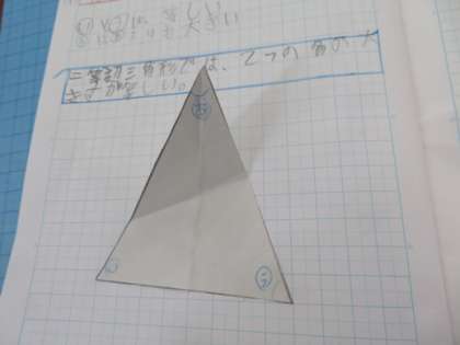 二等辺三角形を作図して,2つの角が等しいことを調べました。二等辺三角形の次は正三角形。正三角形は3つの角の大きさが全て等しいことが分かりました。