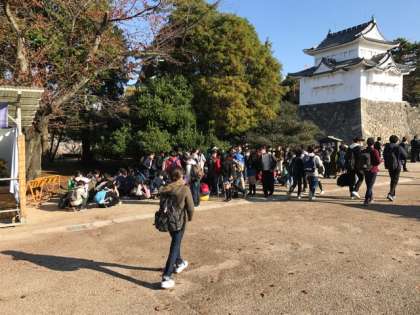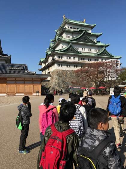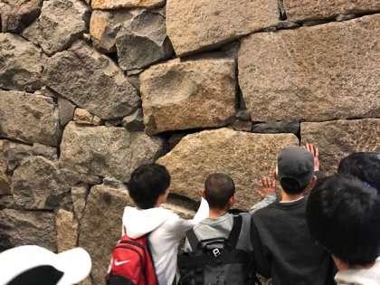 お城を背景にクラス写真を撮った後,天守閣に向かいました。天守閣を支える石垣の大きさや、天守閣の上に付けられている金鯱の大きさに驚く子ども達でした。