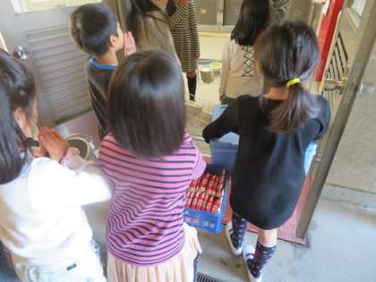 給食当番の子ども達は配膳の仕事をがんばっています。給食室前に来た時には,当番の子ども達が声をそろえて,「いただきます」「ごちそうさまでした」と気持ちの良いあいさつをしています。