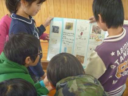 お家の方への買い物インタビューやスーパーの見学などを終えて,学んだことをリーフレットにして発表しました。友だちが見つけた商店のくふうについて聞き,新たな発見や自分とは違う考え方を発見することができたようです。