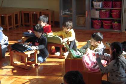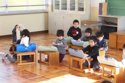 音楽の学習は,教室で行うこともありますが,音楽室には,たくさんの楽器があり,体をつかって活動したり,ピアノの伴奏で歌を歌ったりできるので,1年生も音楽室で学習する時間をとっています。今日は,みんなで「はるなつあきふゆ」の歌を,歌詞を大切に歌った後,鍵盤ハーモニカを練習しました。みんなの顔が見える広い教室での音楽の学習を,みんなは楽しみにしているようです。