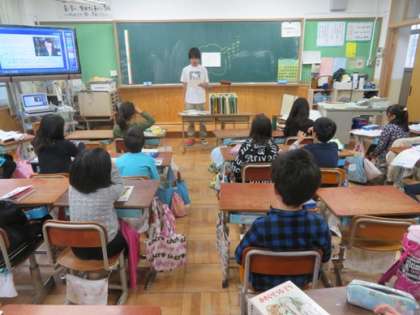 放送委員の6年生が給食時間に流す放送についてのお知らせに来てくれました。給食時間に自分達が作ったクイズが流れます。お話を聞いた後,早速もらった紙にクイズを書いていました。