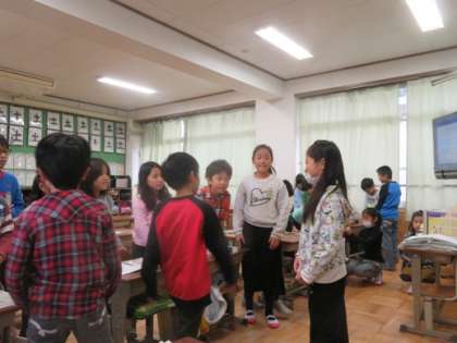 今回みんな遊びでジェスチャーゲームをしました。自分たちで考えたお題でジェスチャーをし,同じグループの子ども達が答えていました。どんなジェスチャーをすれば,相手に伝わるか考え,楽しく遊んでいました。