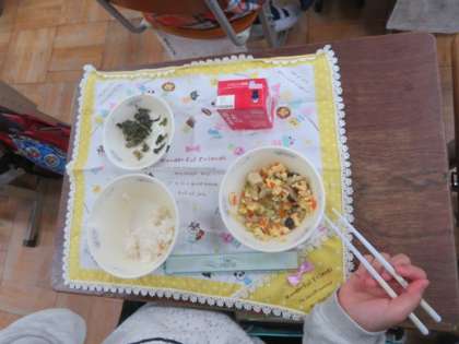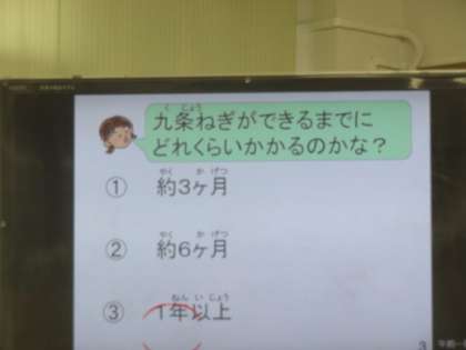 給食室からこんにちはで,その日の給食「高野豆腐の卵とじ」に使われている青ネギ(九条ネギ)に関わるクイズがありました。2枚に写真を見てどちらのネギが九条ネギか,九条ネギができるまでにどのくらいかかるかでした。子ども達は,一年以上かかるということに驚いていました。