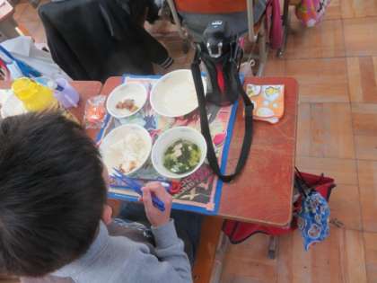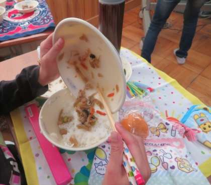 給食にごはん,きのこごはんの具,さといもとこんにゃくの土佐煮,すまし汁,柿が出てきました。きのこごはんの具はご飯に会うおかずでした。ご飯に混ぜて美味しく頂きました。