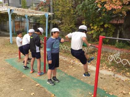 体育の授業で鉄棒を行いました。授業の中では,新しい技に挑戦したり,自分のできる技を組み合わせたりして学習を進めました。教室で見た動画を思い出したり,技のポイントが書かれたカードを見たりして,新しい技を習得しようと一生懸命な姿がたくさん見られました。友達どうしで技を教え合う姿も見られました。