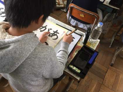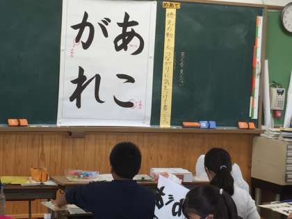書写の学習で「あこがれ」という文字を書きました。平仮名のまるみを筆で書くことや,4文字をバランスよく書くことにに子ども達は苦戦していました。しかし,練習を重ねていくにつれ,一人ひとりが満足いく作品が仕上がっているようでした。