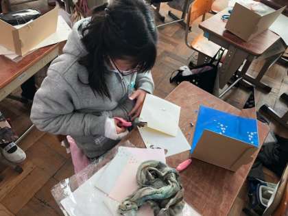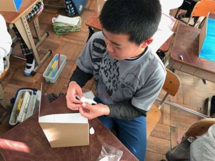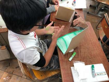 図工科で,鏡の特性を利用した「ミラクル!ミラーステージ」という題材の学習を進めています。紙粘土やはりがね,画用紙等を使って自分だけの鏡の世界を作っています。