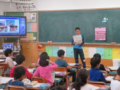代表委員会で物を大切にしようという取組が始まりました。代表委員の子ども達は,その取組を知らせるためにポスターを作ることをがんばっていました。ポスター完成後,担当の教室に取組の説明に行きました。