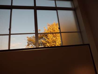 青空に金色に輝いたイチョウの葉,東校舎の階段から美しく見えました。教室では,集中して自分の描いた絵に絵の具やクレパスで彩色しました。だんだん自分の絵が仕上がってきました。