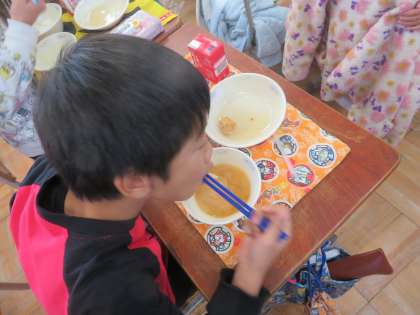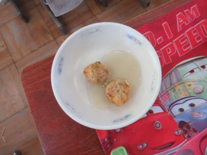 給食に,かんもどきのあんかけが出てきました。がんもどきは,水を切った豆腐に,鶏ひき肉,おから,にんじん,しいたけ,枝豆を混ぜ合わせてから丸め,油で揚げて作っています。だしのきいたあんをかけて食べました。