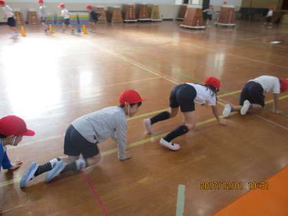 音楽に合わせて,グループごとにリーダーのまねをしながら進みました。