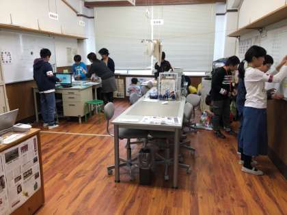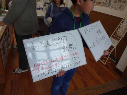 京都新聞社では,各ブースに取材に行ったり,取材内容を基に新聞を作ったりしました。新聞を買ってもらうために,看板のレイアウトを一生懸命考えている人もいました。