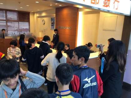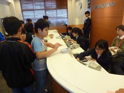 京都銀行では,振り込まれた給料を電子マネーカードに振り替えたり,定期預金をしてもらったりしました。どのピリオドもたくさんのお客さんが来ましたが,一人ひとりに対して丁寧な対応をしていました。