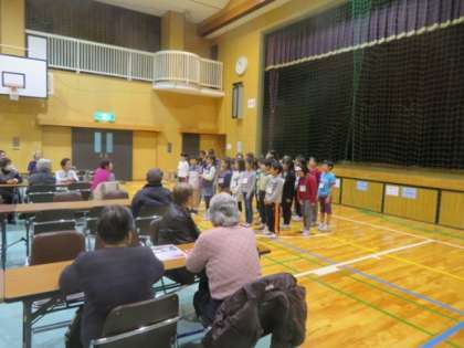 初めに挨拶を行い,次に歌を歌いました。一曲目は,クリスマスも近いので「ジングルベル」,2曲目は,3年生の音楽で学習した「富士山」です。子ども達とお年寄りの方の歌声が互いに響いていました,