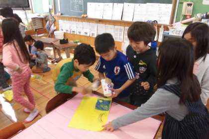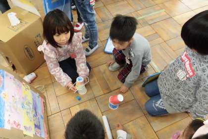 紙コップは,ゴムを挟んで重ねると,高くとんだり,前にとんだりするゲームに変身します。遠くまでとぶと,「すごい」といってもらうのがちょっぴり嬉しかったです。