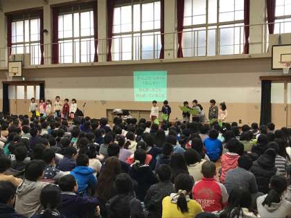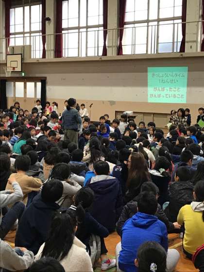 1年生ががんばっていることを全校児童で聞きました。