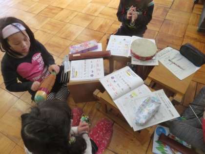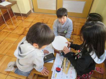 音楽の学習で,どのようにまほうの音楽をつくるのか考えています。学期の持ち方や鳴らし方を変えて自分のイメージに合う音を探しました。そして,自分の見つけた音を言葉や図で表しました。