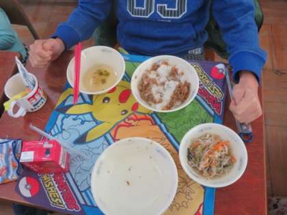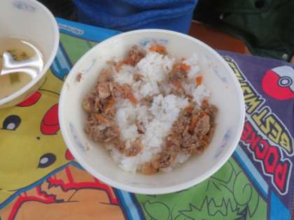 給食にそぼろどんぶりの具が出てきました。そぼろどんぶりの具はご飯にのせて食べました。他にもすまし汁が出てきました。すまし汁は,こんぶとけずりぶしでだしを作られていてだしのうまみを味わっていました。