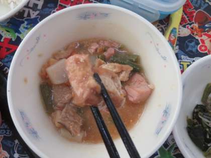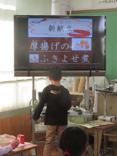 今回の給食の新献立は,厚揚げのふきよせ煮でした。厚揚げ,鶏肉,にんじん,三度豆,たけのこ,しいたけ,こんにゃくをじっくり煮て作られています。「ふきよせ」とは,風にふきよせられて集まった木の実や葉っぱのようにいろどりよくもりつけた料理のことです。