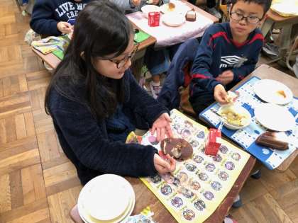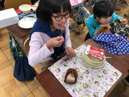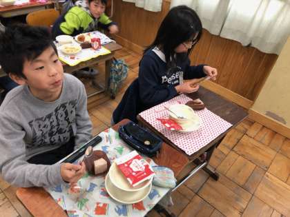 給食でチョコレートケーキがでてきました。子ども達はこの日を心待ちにしており,朝から子ども達どうしの話題に挙がるほどでした。そして給食時間。子ども達は待ちに待ったチョコレートケーキに大喜び!嬉しそうにパクパク食べる人や,大事そうに少しずつ食べている人がいました。また感想を聞いてみて下さい。