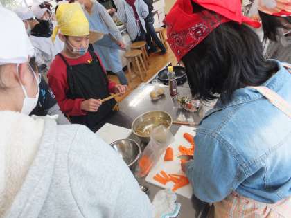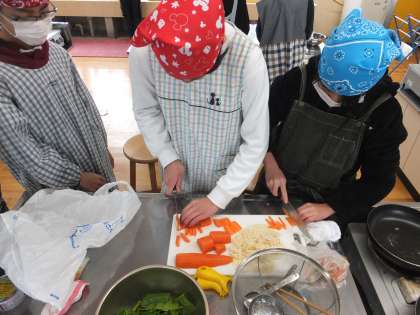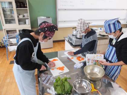 家庭科の「まかせてね 今日の食事」の学習で,調理実習を行いました。まずは具材を切っていきます。作る料理に合わせて具材を上手に切り分けていきます。包丁を持つ手がスムーズに動いている子が多かったです。