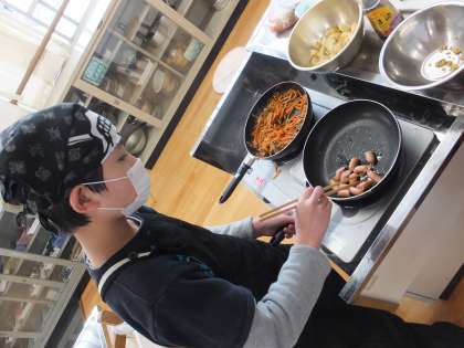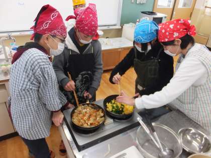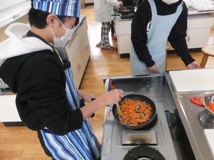 具材を切り終わったら,いよいよ調理です。今回は2品のおかずを作るので,炒める調理をする班や,ゆでる調理をする班とそれぞれ作りたい料理に合わせて調理法を選びました。具材を炒めて,具材が柔らかくなるのを確認し,盛り付けに移ります。