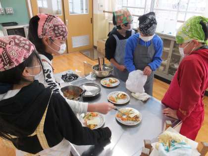 どの班も無事,完成させることができました。出来上がったおかずをお皿に盛りつけて,いただきます。