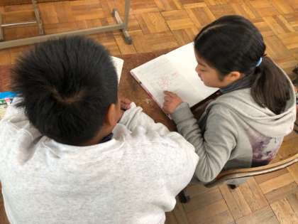算数の「単位量あたりの計算」の単元で,こみ具合についての考え方を説明し合いました。相手に伝わるように,ノートを見せながら説明することができました。